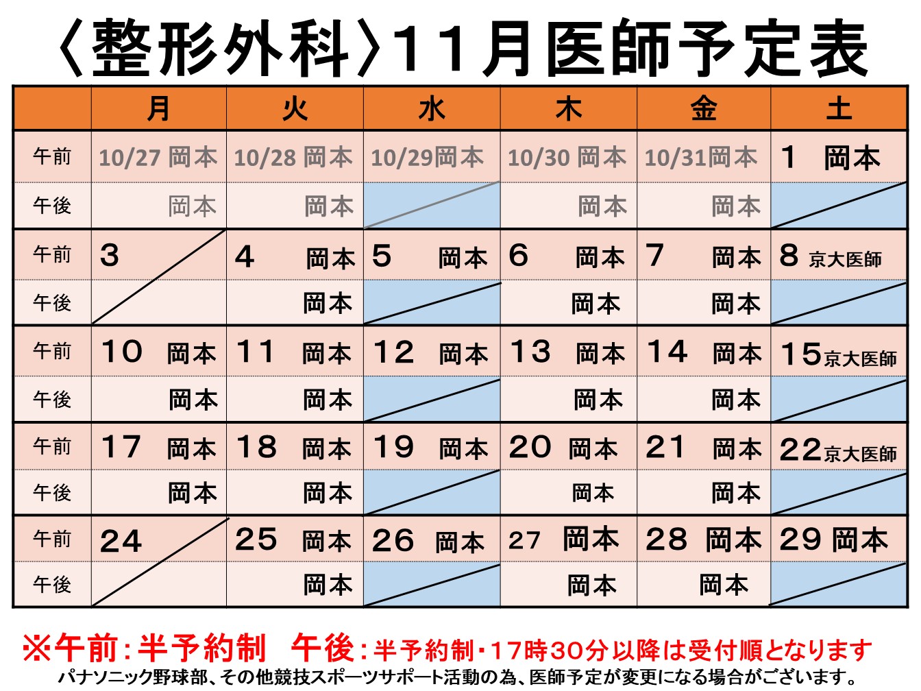 【整形外科】11月14日(金)の診察受付は17時30分(3部)まで、4部は休診、リハビリは通常通り行…